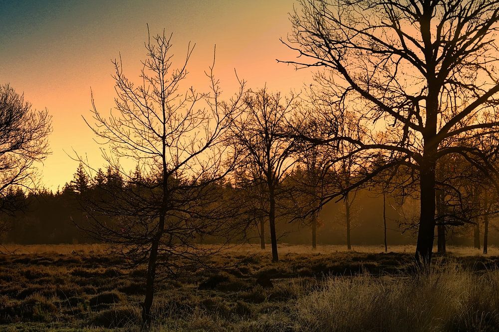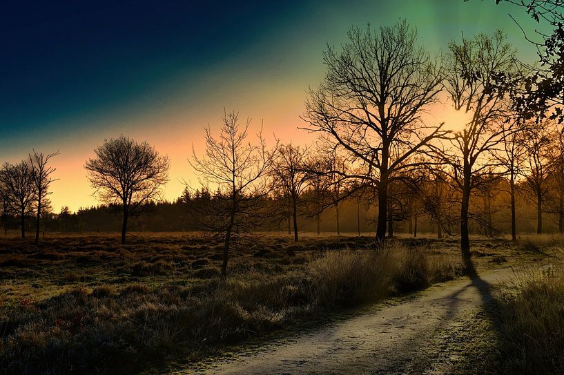 Eine stimmungsvolle Landschaft, in der das erste Licht durch die Bäume bricht und der Weg dazu einlädt, der Stille des Morgens zu folgen. Ein beruhigendes Bild mit warmen Farben und natürlicher Tiefe.