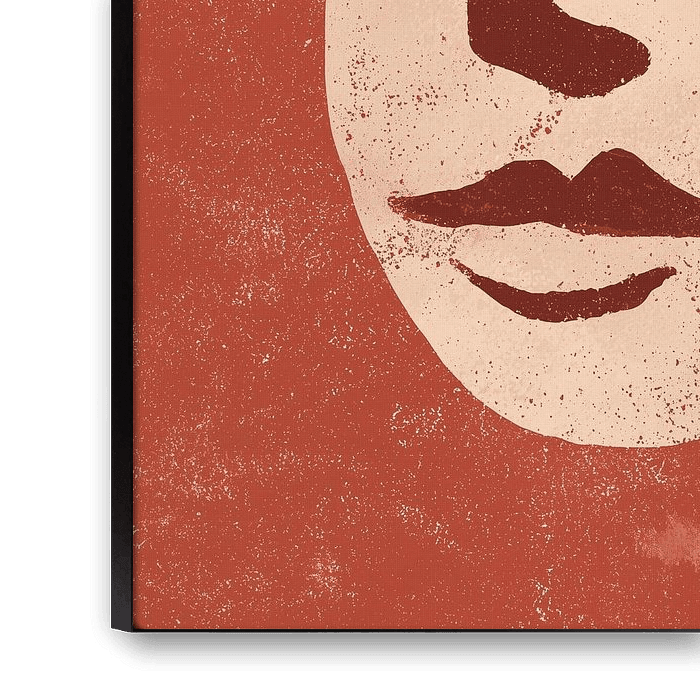 Stilisiertes Gesicht in einer minimalistischen, abstrakten Form, ausgeführt in warmen Erdtönen von Terrakotta und Creme. Die Gesichtszüge - Augen, Nase, Mund und ein einzelner Wangenfleck - sind mit einfachen, kräftigen Linien gesetzt. Die Komposition strahlt Ruhe und Introspektion aus; die geschlossenen Augen suggerieren innere Stille oder einen meditativen Zustand.