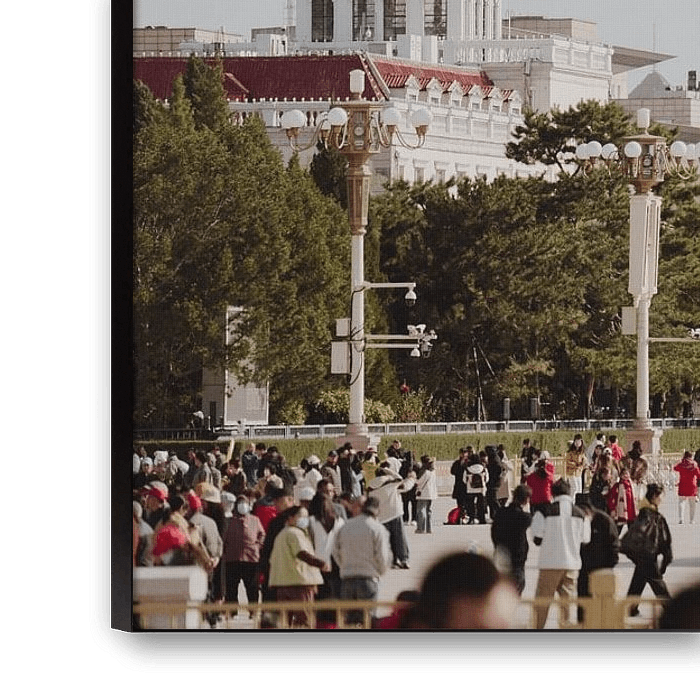 Das Bild zeigt einen belebten Stadtplatz mit vielen Menschen, die spazieren gehen, sich unterhalten und die Atmosphäre genießen. Im Hintergrund sind moderne Wolkenkratzer zu sehen, darunter der markante geschwungene Turm, der als China Zun Building bekannt ist. Es gibt auch klassische Gebäude mit roten Dächern und einem weißen Uhrenturm, die einen historischen Kontrast zur modernen Skyline bilden. Im Vordergrund sieht man einige Busse und Fahrzeuge, die an einen geschäftigen Tag in der Stadt erinnern.