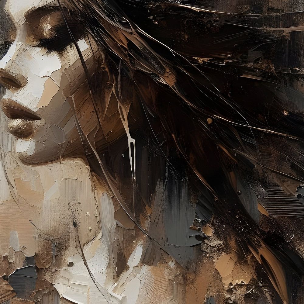 Eine Frau mit tiefem, gewelltem Haar erwacht in satten Schichten von Ölfarbe zum Leben, eingehüllt in Beige-, Braun- und Goldtöne. Ihre Präsenz ist leise, aber kraftvoll, als würde sie ihre Geschichte in Schatten und Licht flüstern. Der warme Hintergrund steht in subtilem Kontrast zu ihren dunklen Locken, so dass sie von der Leinwand zu leuchten scheint. Mit jedem Pinselstrich wird ein Hauch von Sanftheit, Geheimnis und innerer Tiefe eingefangen. Eine Ode an stille Stärke und natürliche Schönheit.