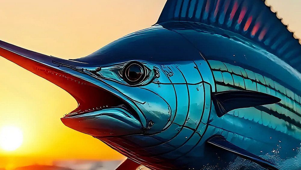 In dieser friedlichen Abendstimmung wirkt der Marlin fast wie ein lebendiges Kunstwerk, während er in geschmeidigen Bewegungen durch die Wellen gleitet. Seine kraftvollen Schwimmzüge ziehen kleine Wassertropfen hinter sich her, die im Sonnenlicht glitzern. Der Ozean ist ruhig, und die Luft ist erfüllt von einem leichten Brisen, die den salzigen Geruch des Meeres mit sich trägt.