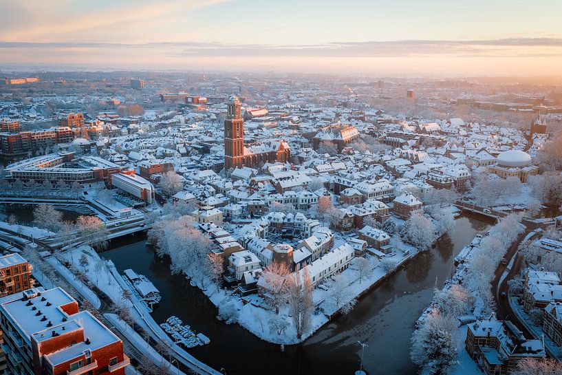 Ein seltener stiller Moment über Zwolle. Vom Himmel aus betrachtet entfaltet sich die Stadt unter einer weichen Schicht aus Neuschnee, als ob die Zeit für einen Moment stehen geblieben wäre. Das historische Stadtzentrum wirkt ruhig, die Dächer, Straßen und Bäume bilden ein friedliches Wintermuster. Der Peperbus erhebt sich majestätisch…