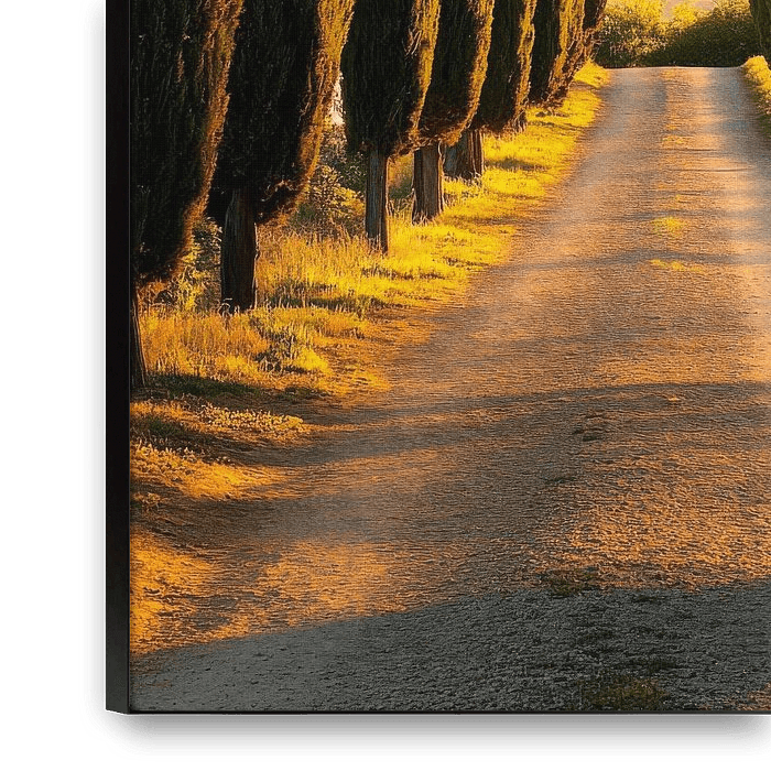 Bestelle dieses Landschafts-Wandbild Zypressenallee Sonnenuntergang von Poster Art Shop als Reproduktion auf Leinwand, Alu-Dibond, als Poster, Fototapete oder Acrylglasbild.