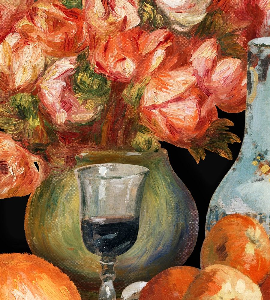 Ein Stillleben mit Obst, Wein und Blumen auf einem schwarz-weiß gestreiften Hintergrund.
