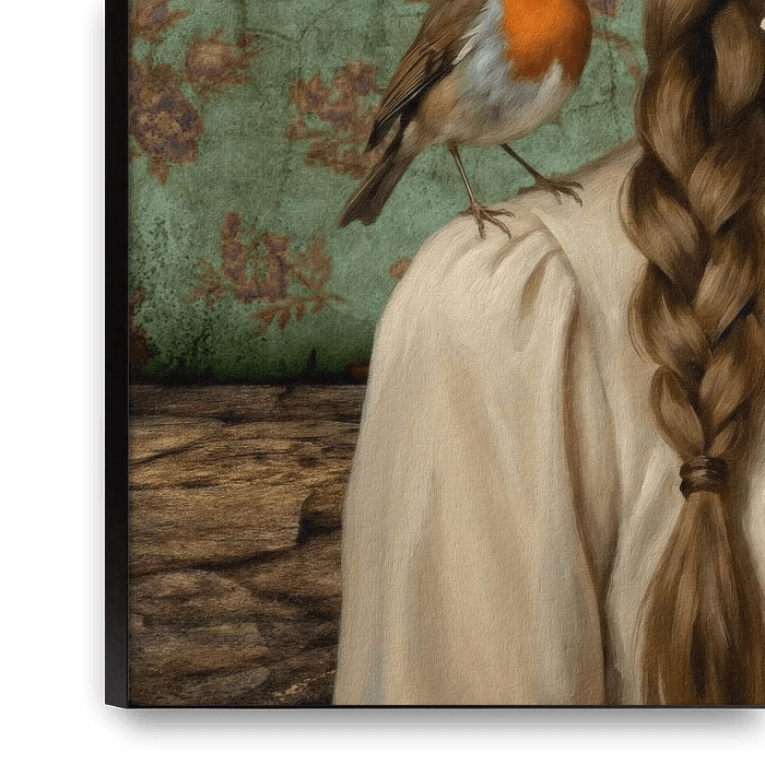 Ein unter anderem mit Hilfe von KI (Künstliche Intelligenz) geschaffenes Gemälde. Dieses faszinierende Kunstwerk von J.O. Han zeigt eine junge Frau mit langen, geflochtenen Haaren und einem Samt-Halsband mit einer roten Rose, die einen intimen Moment mit einem neugierigen Rotkehlchen teilt, das auf ihrer Schulter balanciert. Die zarten…