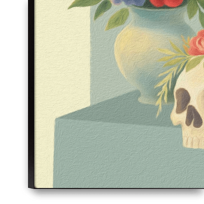 Eine moderne (und fröhlichere) Version eines klassischen Stilllebens, einer Vanitas, wie sie vor langer Zeit von den alten Meistern gemalt wurde, in weichen, pudrigen Farben.