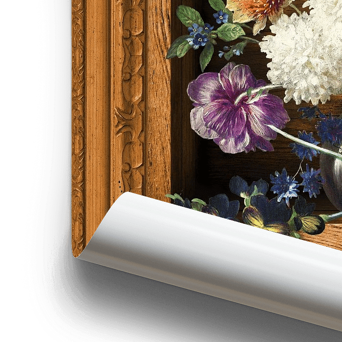 In meiner Bearbeitung steht die Vase mit Blumen in einem antiken hölzernen "Schattenkasten", einem dreidimensionalen, tiefen Rahmen.