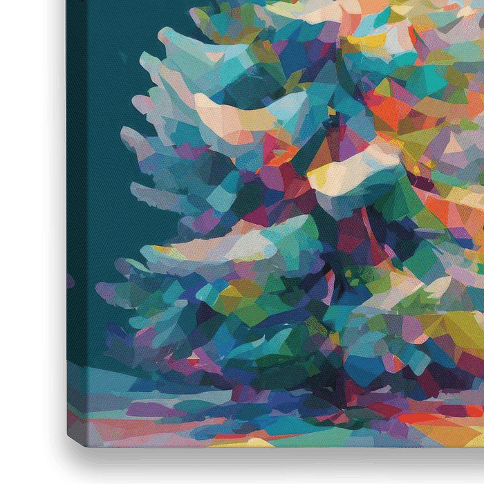 Dieser Weihnachtsbaum ist eine lebendige und moderne Farbexplosion, die sich aus verschiedenen geometrischen Formen zusammensetzt. Jeder Zweig und jedes Blatt besteht aus sich überlappenden, bunten Dreiecken und Vierecken, die einen kaleidoskopischen Effekt erzeugen. Die Farben umfassen leuchtende Rot-, Gelb-, Grün-, Blau-, Violett- und…