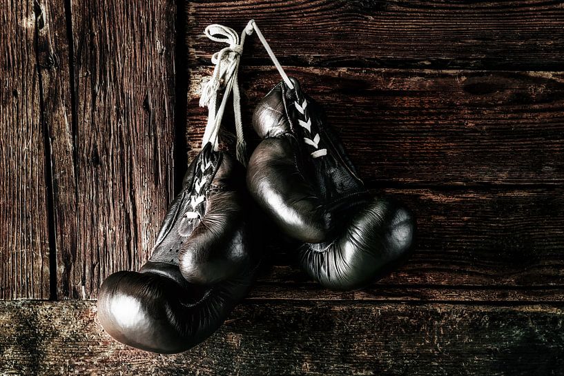 Über „alte Boxhandschuhe aus Leder vor rustikaler Holzwand“ von Jürgen Wiesler