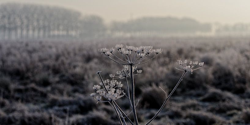 Reif, kalt und grau. Die Sonne ist gerade aufgegangen und beleuchtet die Pflanze von hinten.