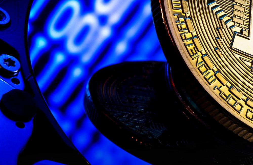 Nahaufnahme einer Bitcoin auf einer Festplatte