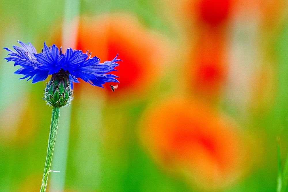 Blaue Kornblume in einem Kornfeld. Farbtupfer in der Landwirtschaft.