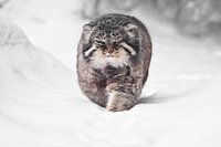 brutal fluffy wild cat manul on white snow comes right at you full face, power and fluffiness.