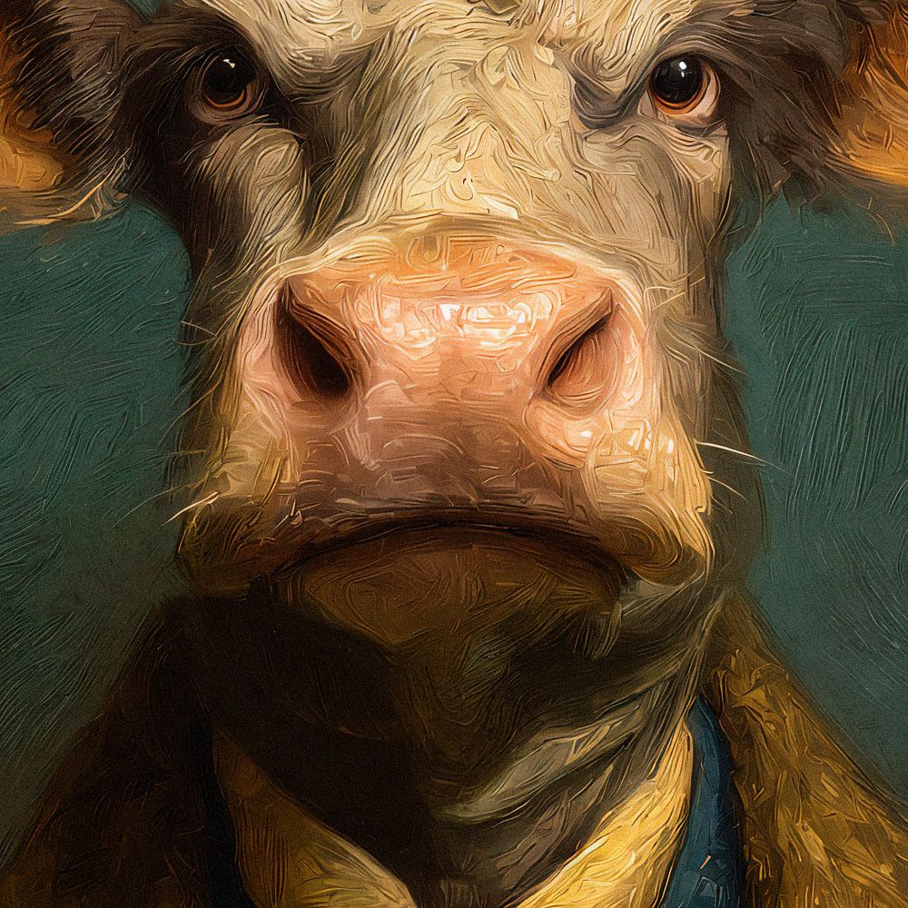 Malerisch-surreales Porträt eines Stiers in einem klassischen Kostüm. Humorvoll und stilvoll, eine Mischung aus Tier und Mensch im altmeisterlichen Stil. Perfekt als markantes und verspieltes Kunstwerk in einem modernen oder klassischen Interieur