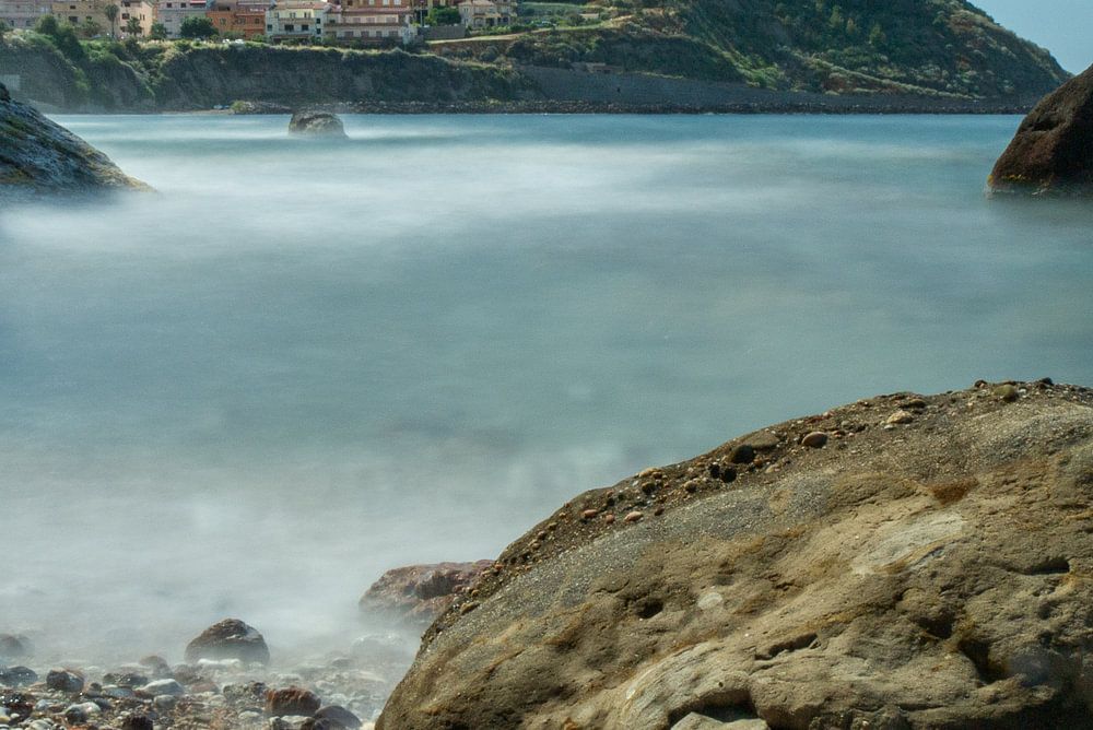 deze foto is gemaakt met een lange sluitertijd. hierdoor is de zee glad. met rotsen op de voorgrond en castelsardo op de achtergrond. sardinie italie