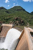 waterval bij het meer van de blijde rivier met de drakensberg op de achtergrond
