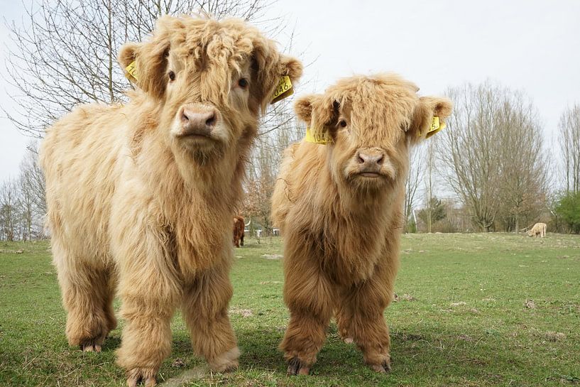 twee blonde schotse hooglander kalfjes, kijkend naar de camera. ze staan in een weiland