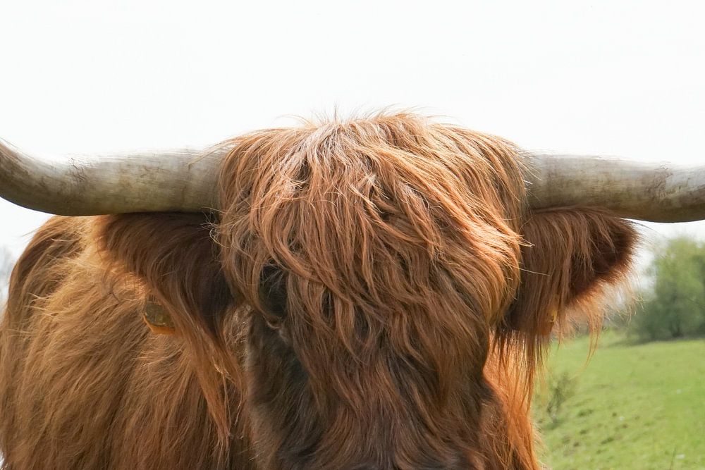 een kleur foto, van de kop van een schotse hooglander, met enorme hoorns