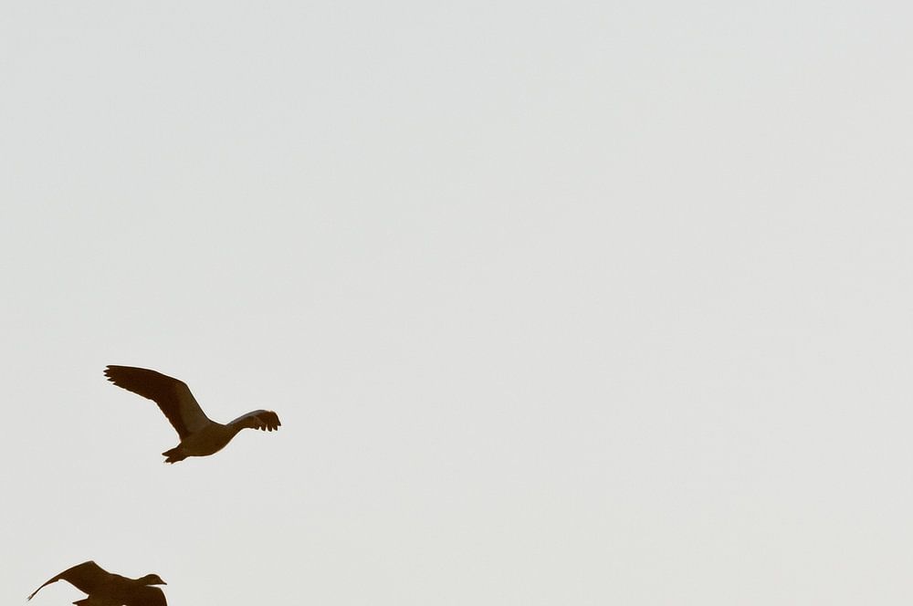 Minimalistische Aufnahme von zwei Gänsen, die über den Himmel fliegen. Die Aufnahme sieht schwarz-weiß aus, aber wenn man genau hinsieht, kann man erkennen, dass sie ein wenig Farbe enthält. Die Aufnahme entstand in Veldhoven, früh am Morgen.