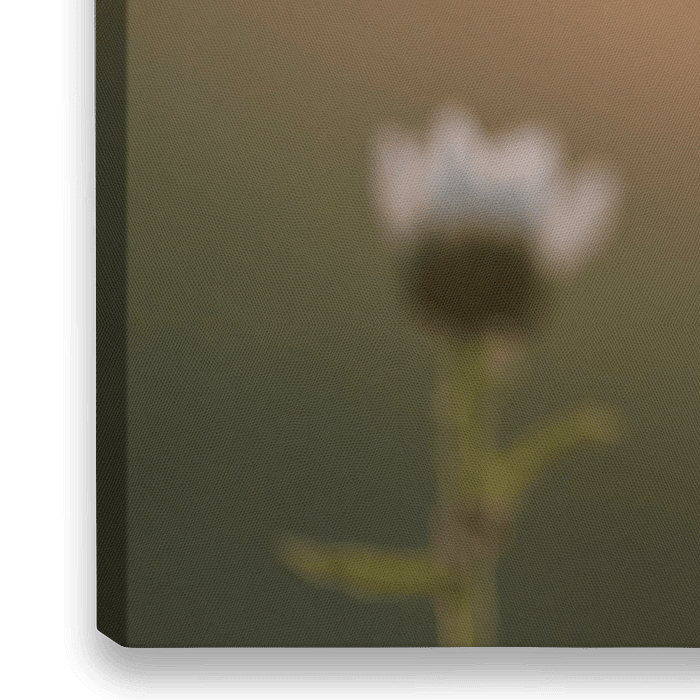 Nahaufnahme eines Gänseblümchens, im Hintergrund die aufgehende Sonne, dunstige andere Gänseblümchen und der orange Himmel