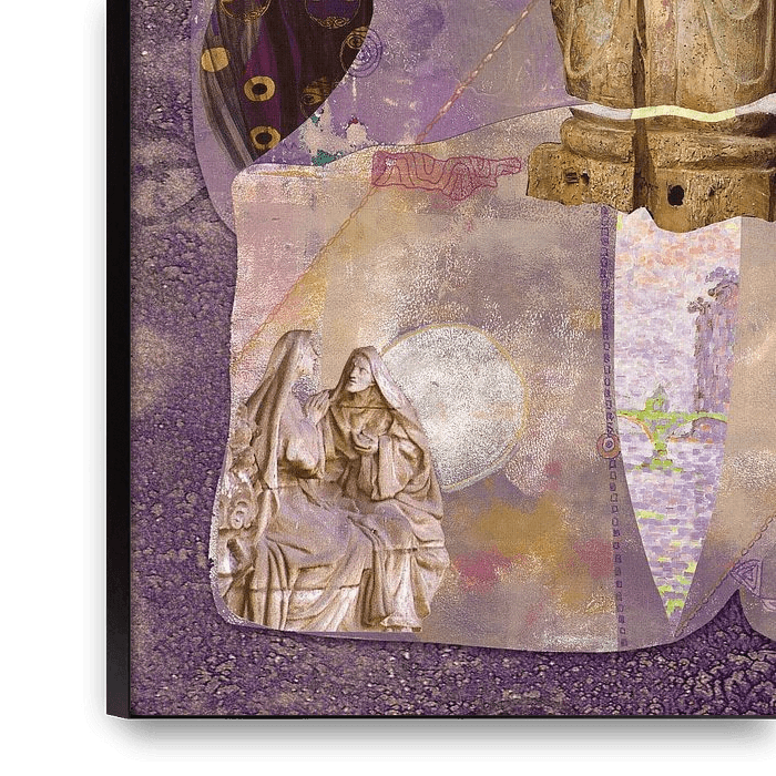 Nennen Sie es Mixed Media, nennen Sie es Collagen: Was ich mache, ist das, was die Arbeit selbst verlangt. Manchmal viele Bilder, manchmal gezeichnet und koloriert, manchmal ein Hintergrund aus Aquarellfarben, manchmal aus Gelli-Drucken, manchmal mit Schablonen, manchmal mit Text. Manchmal ist eine Farbe der Ausgangspunkt, manchmal ein bestimmtes Bild, manchmal ein Text, eine Geschichte oder einfach das Bedürfnis, Motive zu färben oder sogar Nadel und Faden zu benutzen. So…