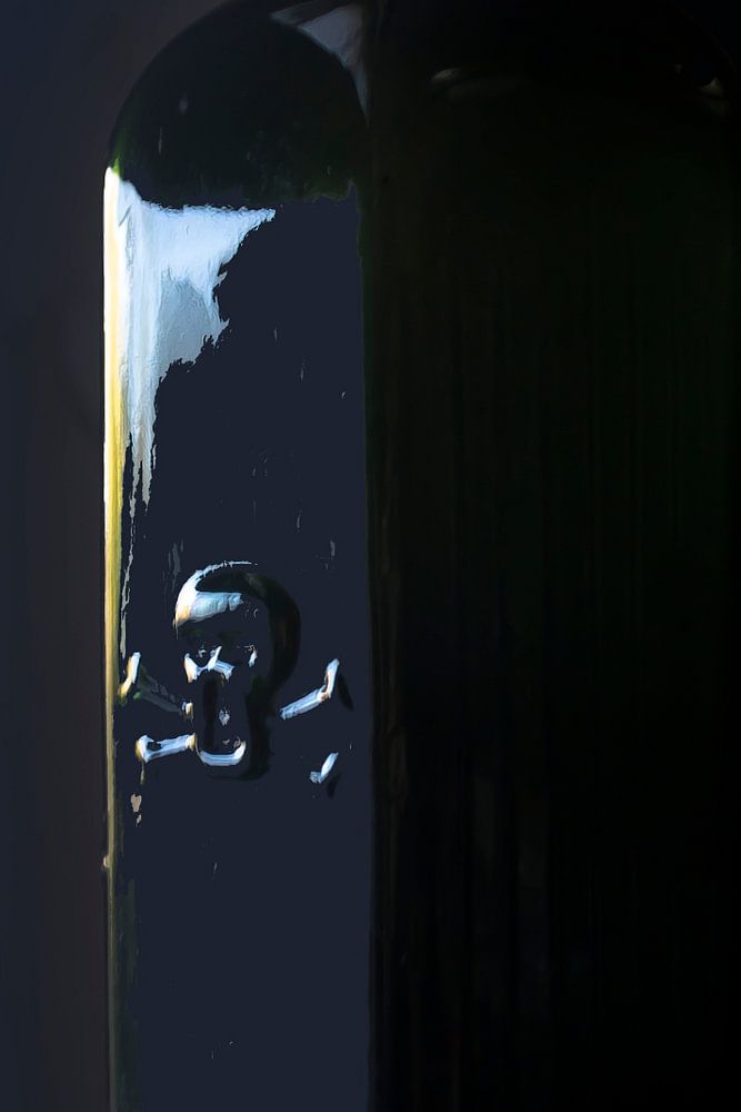Fles. Fles met doodskopje. skull op flesje.mininaal art ..een stilleven ,in donkere zwarte kleuren .