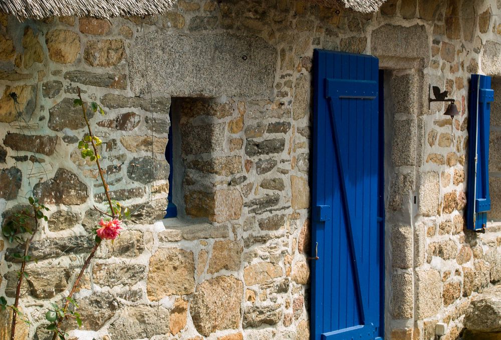 typisches französisches haus mit blauen fensterläden in der bretagne, frankreich im pitouristischen dorf karascoet.
