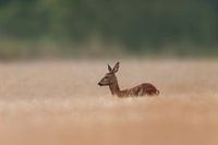 ein Reh Ricke (Capreolus capreolus) sitzt auf einem abgeernteten Weizenfeld
