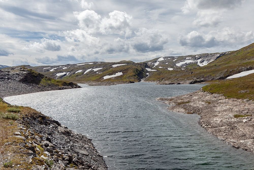 eine leere Straße schlängelt sich durch eine karge, monochrome Hochebene mit Hügeln, Seen und Schneefeldern