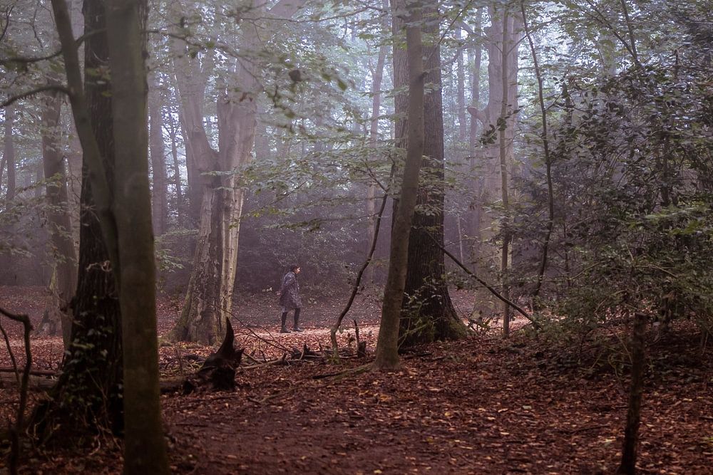 Ein Wanderer im herbstlichen Wald. Früh am Morgen mit den klaren Farben des Herbstes