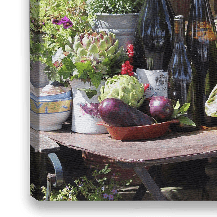 Nur ein Stillleben auf der Straße vor einem Haus in einer kleinen Stadt. In einem kleinen Garten stand dieser Tisch mit (Wein-) Flaschen, Obst und Gemüse, Blumen und Pflanzen.