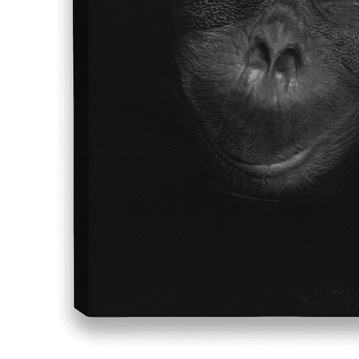 Bestelle dieses Porträt freundliches Orang-Utan-Gesicht mit orangefarbenen smarten Augen und schwarz-weißer Stahlhaut in Nah von Michael Semenov als Reproduktion auf Leinwand, Alu-Dibond, als Poster, Fototapete oder Acrylglasbild.