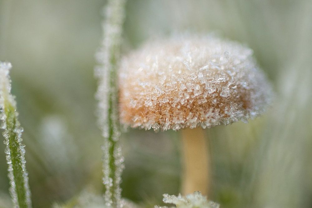 Ein kleiner Pilz mit eiskaltem Frost im Gras. Ein Bild, das Sie in eine magische Makrowelt entführt.