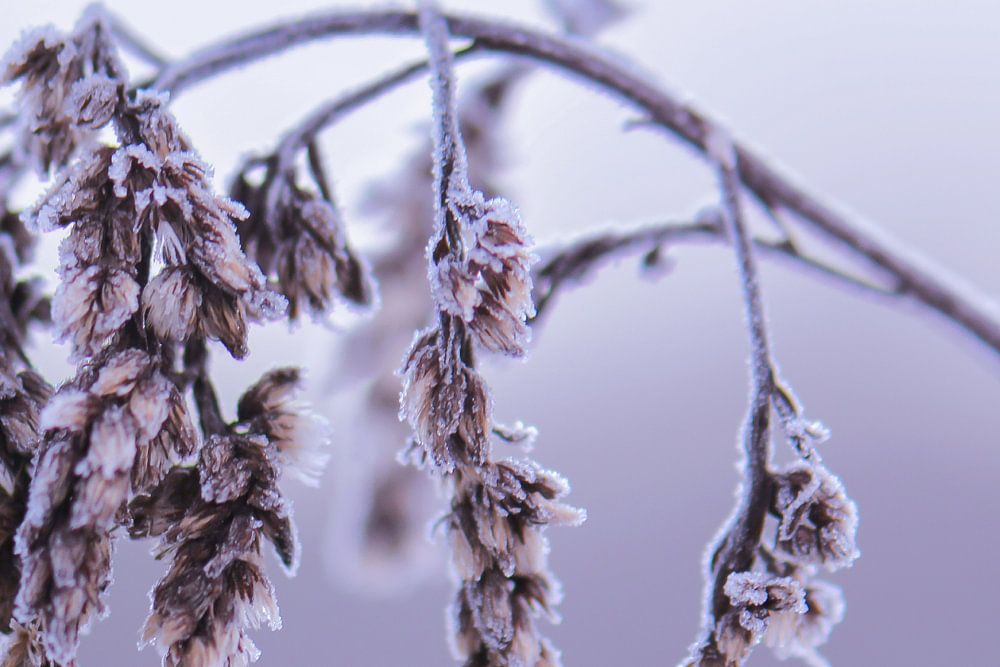 bevroren plant op de heide met mooie ijskristallen en blauw-paarse achtergrond