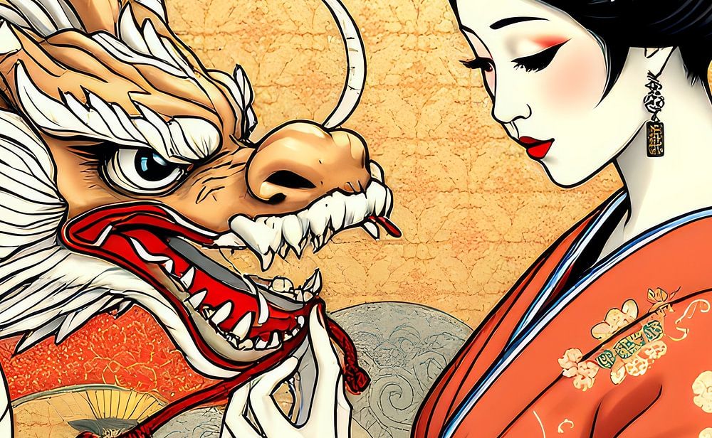 Bildliche Darstellung einer fiktiven japanischen Geisha, japanische bildende Kunst