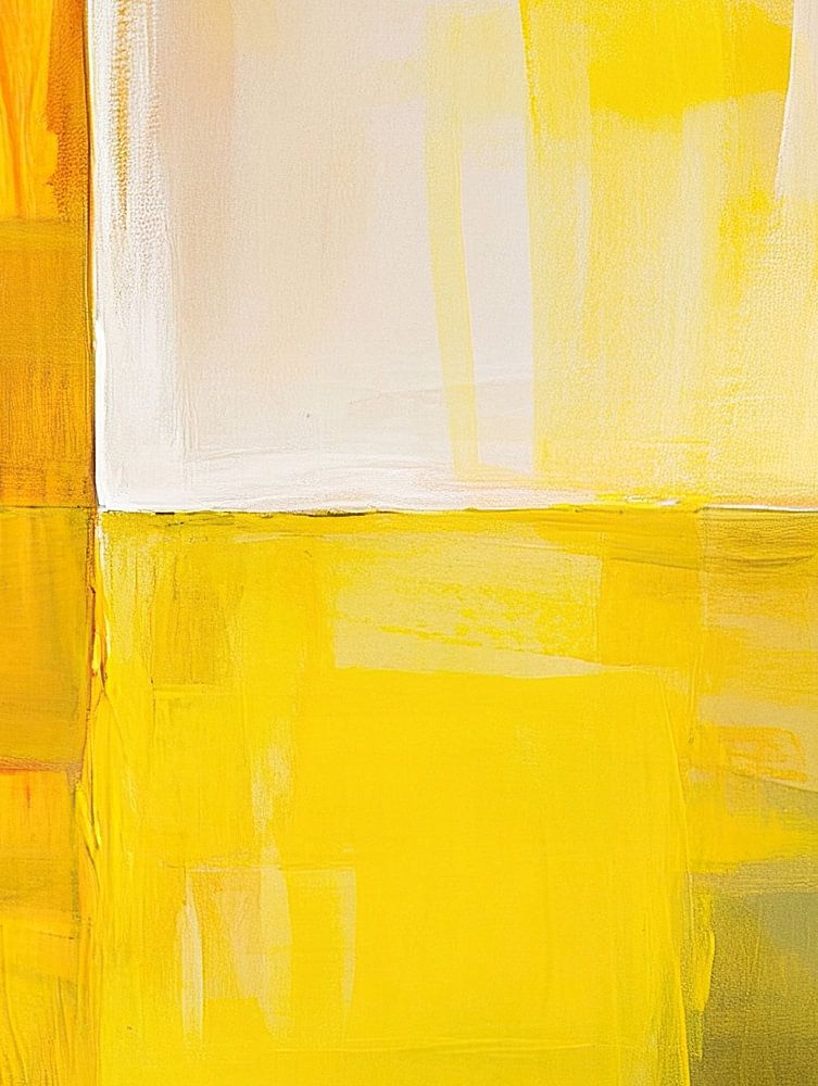 Gelbe Blöcke – Dieses abstrakte Gemälde zeigt große gelbe Blöcke neben einem cremefarbenen Quadrat im oberen Bereich mit sichtbaren Pinselstrichen und weicher Textur in einem modernen geometrischen minimalistischen Stil, ein frisches abstraktes Gemälde und abstraktes Gemälde, das auch gut als gelbes Gemälde funktioniert.