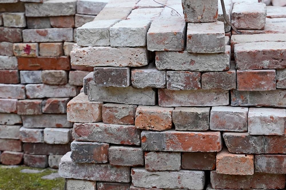 gestapelte Ziegel und alter Bauhelm auf einer Baustelle