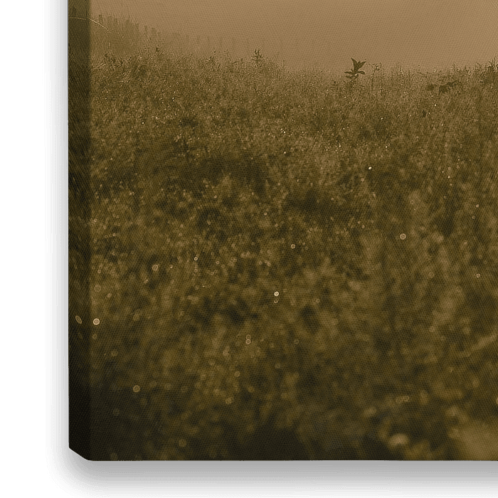 die Landschaft in Gelderland, wo die Sonne über einem Feld voller Disteln aufgeht, wo der Morgennebel wie eine Decke über ihr hängt