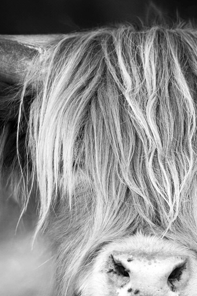In dieser Schwarz-Weiß-Aufnahme kommt die zeitlose Schönheit des Hochlandbewohners zum Vorschein. Die Abwesenheit von Farbe verstärkt die Intensität der Komposition und unterstreicht die Essenz des Bildes. Die Details des zotteligen Fells und die Textur der Hörner kommen wunderbar zur Geltung und unterstreichen den Charakter und die natürliche Größe des Tieres.