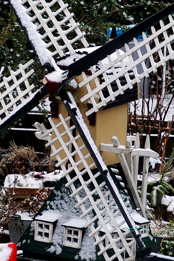 Im Garten befindet sich diese Mühle mit den fröhlichen Zwergen. Im Winter bekommt der Gnom einen weißen Hut und die Segel und das Dach der Mühle tragen eine schöne Schneedecke.
