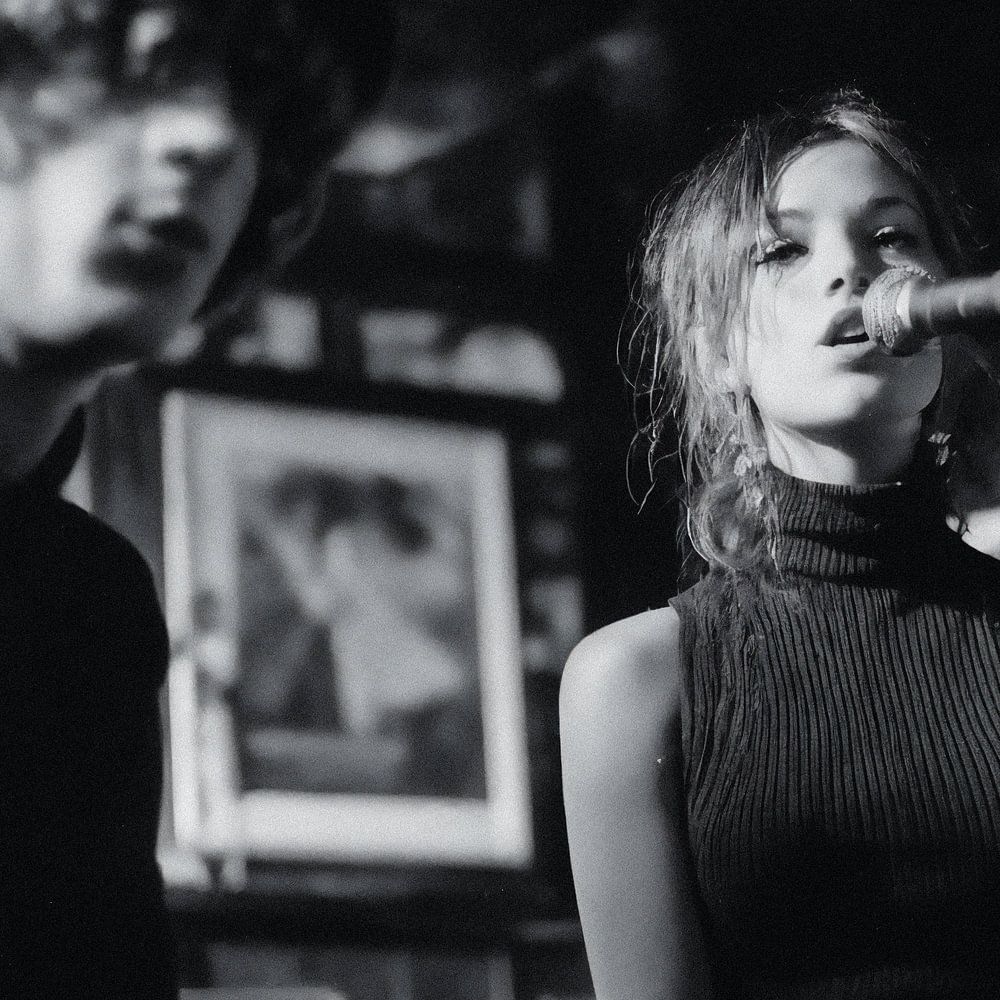 eine junge frau mit frisur steht hinter einem mikrofon und singt. sie stehen auf einer bühne in einem café und machen live-musik.