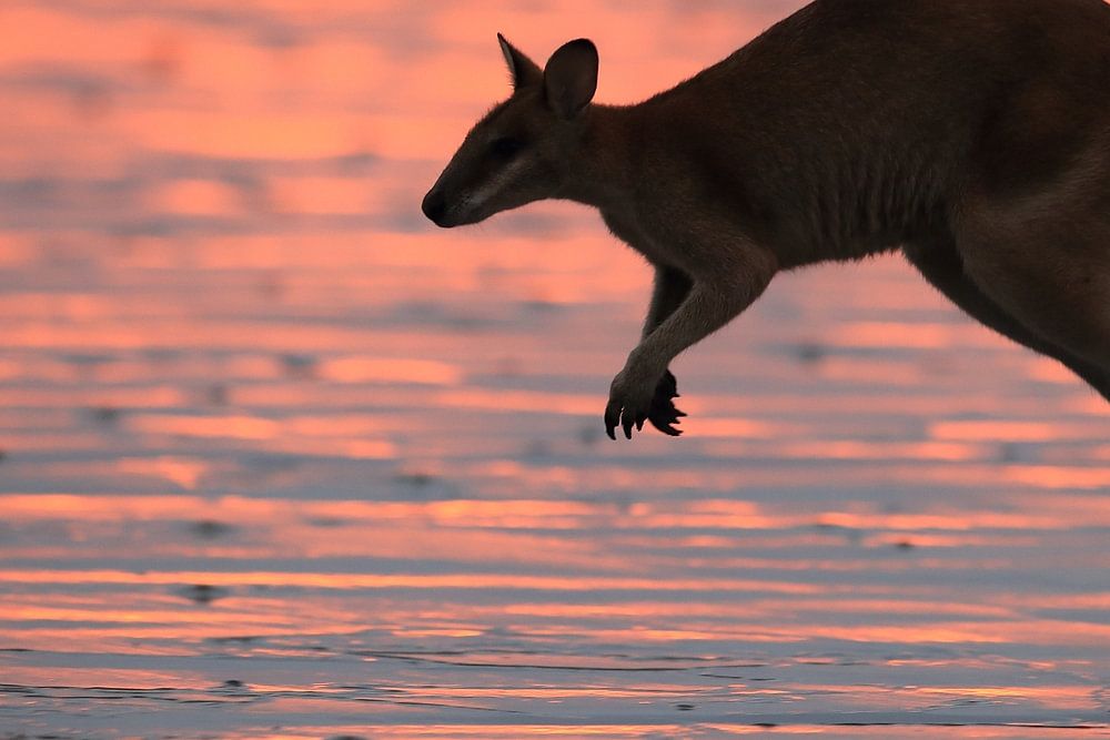 kangaroo on beach at sunrise, mackay, north queensland, australia