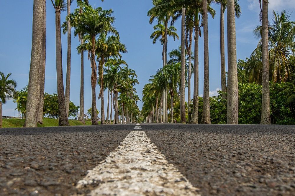 Eine Palmen Allee wie in Miami, hier aber auf Grande Terre, Guadeloupe. Traumhaftes Wetter in der Karibik auf den Französischen Antillen. Türkis blaues Meer und Palmen, dazu tropische Pflanzen, was braucht man mehr?