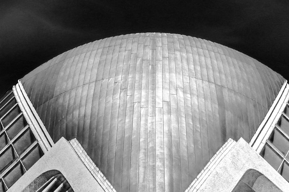 Schwarz-Weiß-Foto von The Hemisfèric in Valencia. Es ist ein einzigartiges und spektakuläres Gebäude, das von Santiago Calatrava entworfen wurde und ein großes menschliches Auge, das Auge der Weisheit, darstellt. Dieses Element symbolisiert das Aussehen und die Wahrnehmung der Welt, die der Besucher durch überraschende audiovisuelle Projektionen entdeckt. Es war das erste Gebäude der Cuidad de las Artas y las Ciencias.