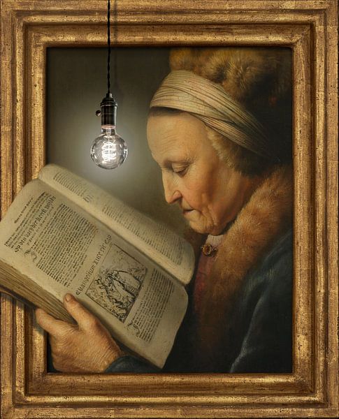 Eine alte Frau liest spät am Abend ein Buch.