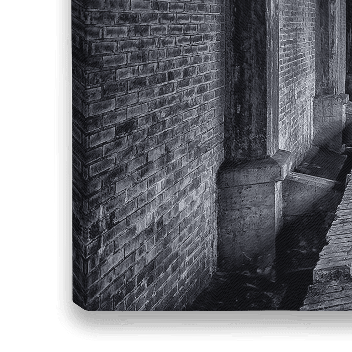 Urbane Erkundung langer Korridore in Schwarz und Weiß mit viel Tiefe