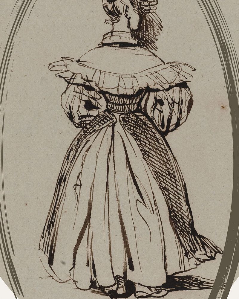 Historischer Druck eines Mädchens. Romantische Skizze in ovaler Form.