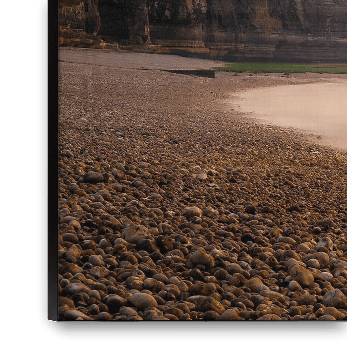 Les falaises d'Etretat ist ein spektakulärer Küstenabschnitt im Westen Frankreichs. Der Sonnenuntergang und die lange Verschlusszeit erzeugen ein beruhigend warmes Bild.