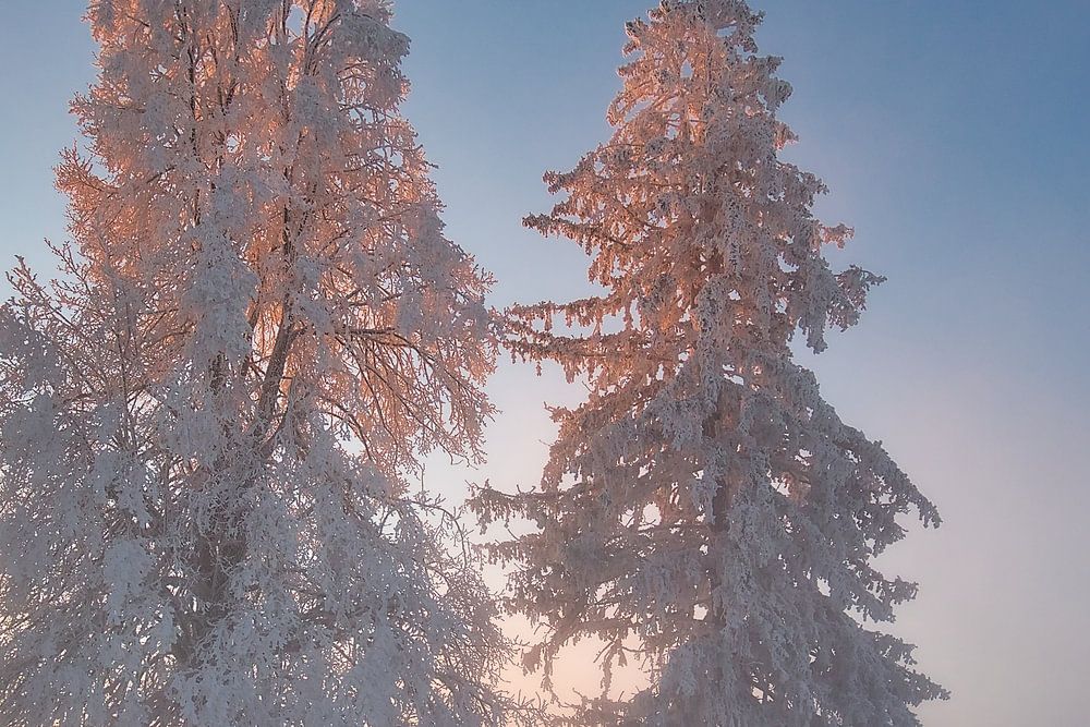Dieses Bild zeigt zwei alleinstehende Bäume, die nebeneinander im Morgennebel stehen. Ihre Kronen werden vom warmen Licht der tiefstehenden Morgensonne angestrahlt, das von schräg hinten einfällt und die oberen Äste in ein zartes Gold taucht. Die feinen Strukturen der belaubten oder kahlen Wipfel heben sich filigran gegen den hellen Himmel ab – fast als würden sie im Licht schweben.