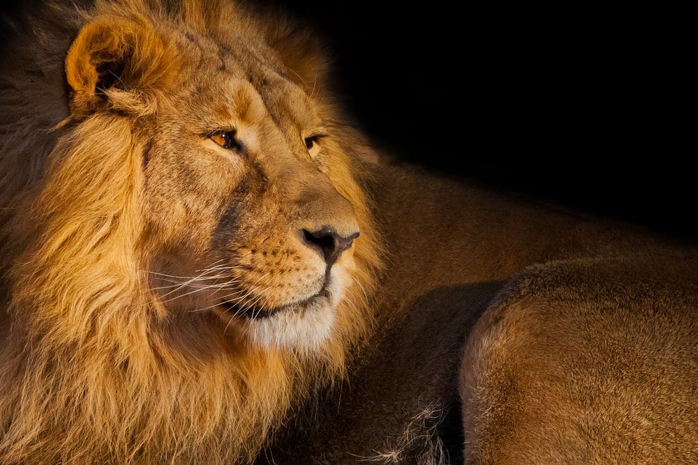 löwe auf schwarzem hintergrund. kraftvoller, gutaussehender löwenmann mit prächtigem haar liegt auf dem boden und schaut. gelbes abendlicht.